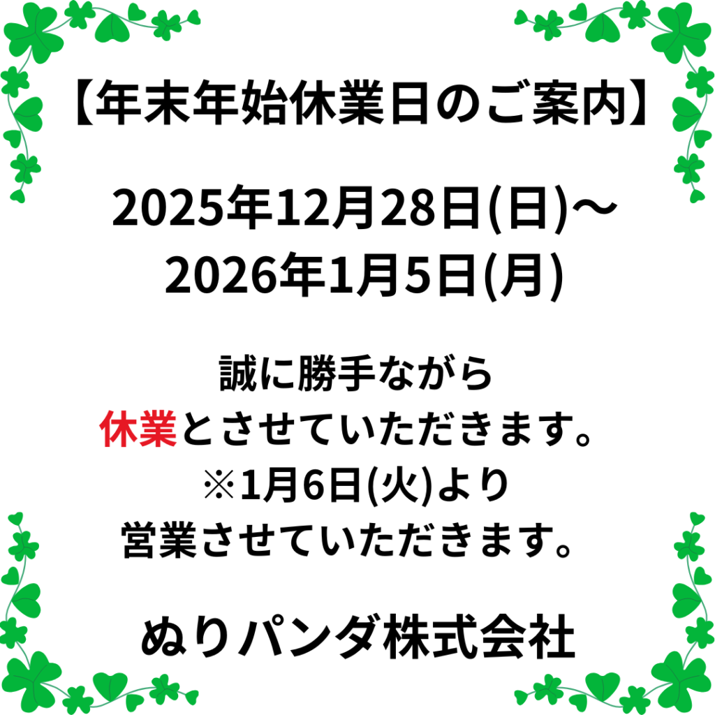2025年12月16日 お知らせ 年末年始休業日のご案内 皆様いかがお過ごしでしょうか?事務パンダ🐼は、治りかけの風邪をいまだに引きずっております💦寒い日が続きます、できるだけ体を温めて、風邪などひかれませんよう気をつけてくださいね🥰 年末年始休業日のご案内です。よろしくお願い致します🙇 カテゴリー: お知らせ 記事一覧に戻る