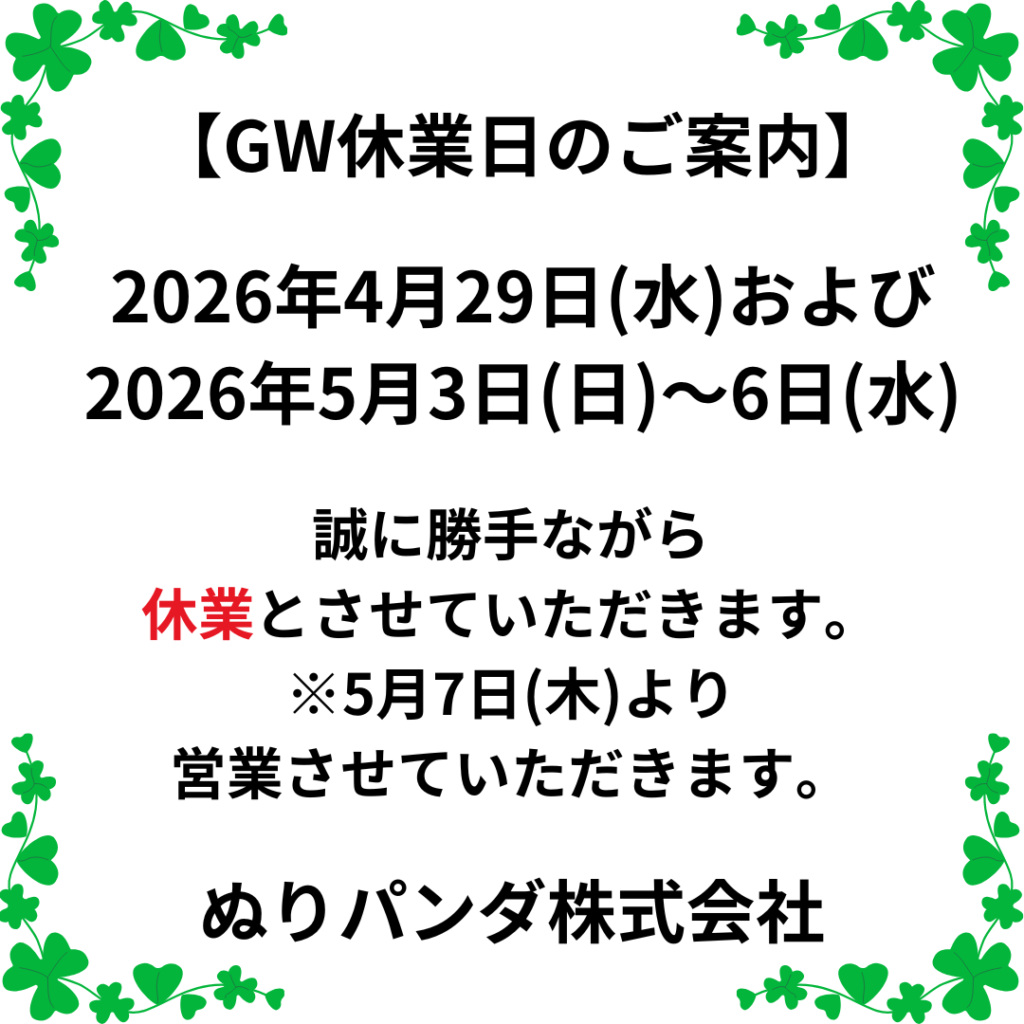 2026年4月21日 お知らせ GW休業日のお知らせ 過ごしやすい季節になりましたね。皆様、いかがお過ごしでしょうか?事務パンダ🐼は、花粉の次は黄砂にも振り回され、鼻詰まりが解消されず苦しい毎日です💦GW休業日のご案内です。よろしくお願い致します🙇 カテゴリー: お知らせ 記事一覧に戻る